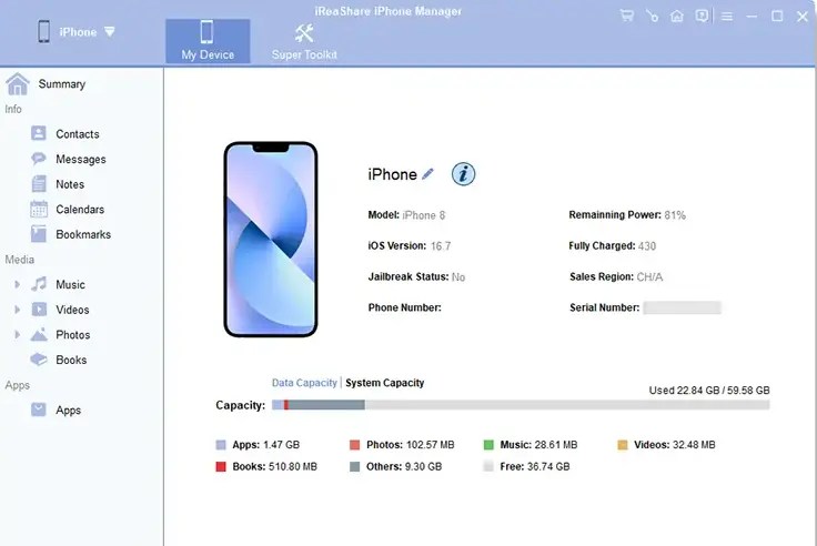 The software handles backup and restoration and functions independently of iTunes. With iReaShare iPhone Manager, users can connect their iOS device to a PC, view detailed data visualizations, preview files, and decide to export or transfer files selectively using a checkbox system.