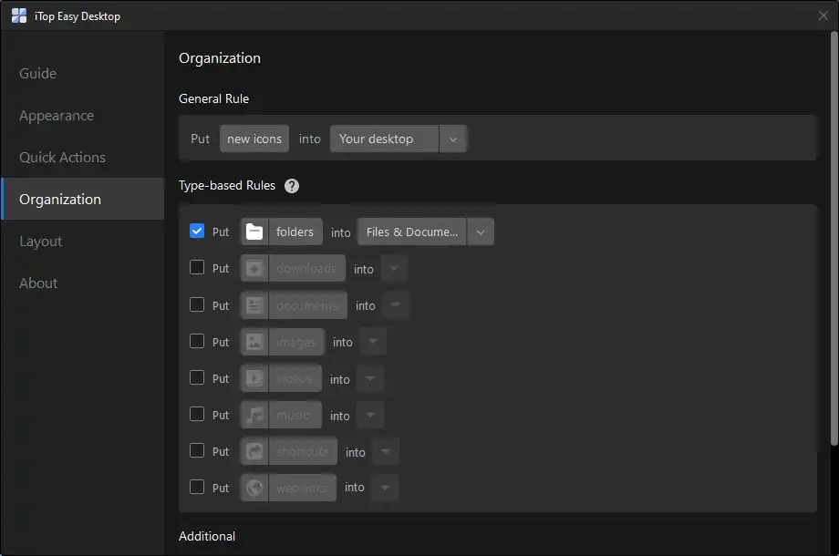 iTop Easy Desktop is a small, easy-to-use desktop manager that lets you organize your desktop icons, files, and folders according to your own rules. You won’t have to manually organize your desktop icons anymore.