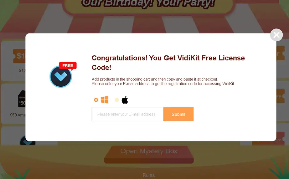 Click the “Open Mystery Box” button, you can either 5% off or a $10 coupon, or a Vidikit license similar to the below screenshot.