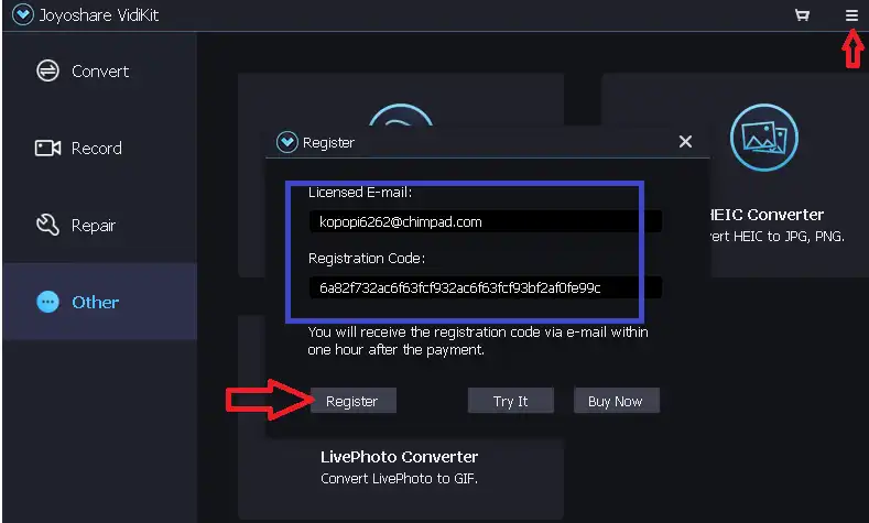 Install the software, start it up, click the “hamburger” icon on the main screen, and then click “Register” in the drop-down menu.