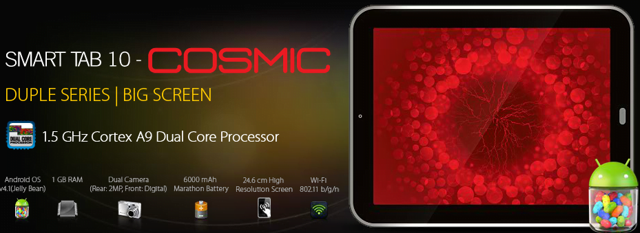 Karbonn Cosmic Smart Tab 10 aka Smart Tab 10 arrives with Android 4.1 Jelly Bean running out of the box and features a 9.7-inch capacitive display with a resolution of 1024×768 pixels, 1.5GHz cortex A9 dual-core processor manufactured by MediaTek, 1GB DDR3 RAM, 2MP rear camera, front VGA camera, G-sensor , 3D G-sensor and 6000 mAh Li-Ion battery.