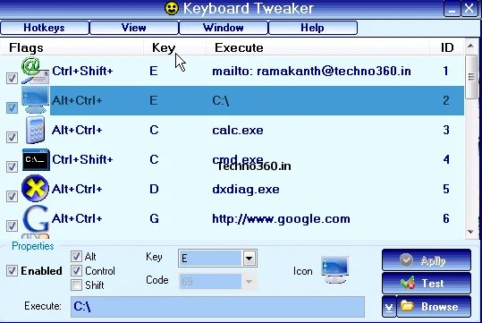 On startup it will display the list of preconfigured keyboard shortcuts ,we can customize shortcuts, all combinations of ” Ctrl, Alt or Shift” can be used with any of the keys . For Instance the we can use combination Alt+Ctrl+G to open google.com,although we can use single keys to run an application but it will cause difficulties when you are typing any document.For example If you configured, key “V” for vlc player, when you type a letter “V” it will automatically run VLC player, but you will be unable to type letter “V” on any document.So it better to use Alt,ctrl,shift combination along with key. Before applying a keyboard shortcut you can test its function by clicking “Test” button
