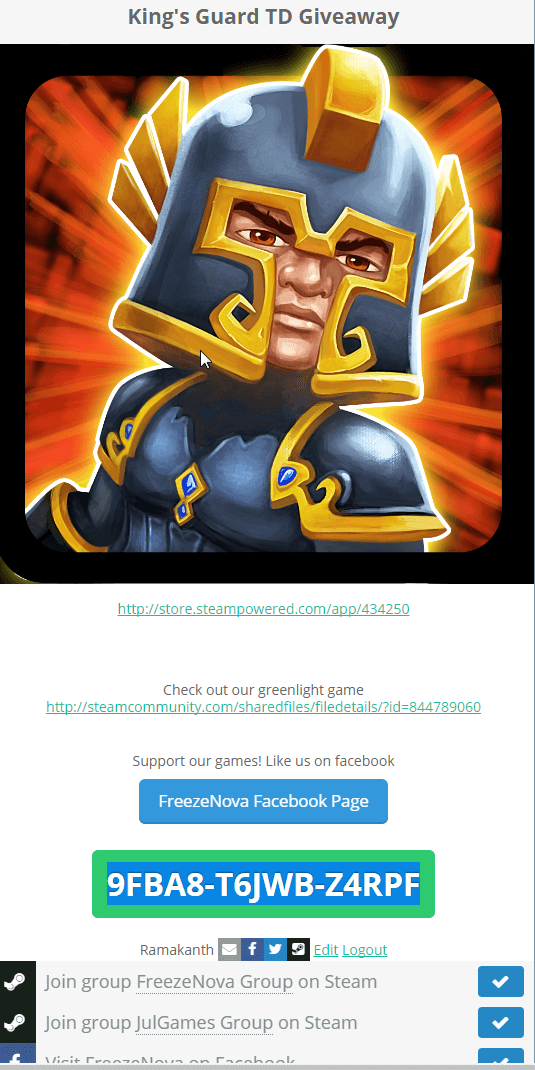In the same way, complete the second task and proceed to visit Facebook fan page of the developer to complete the third task, on completing the 3 task the giveaway page will reveal the steam key.