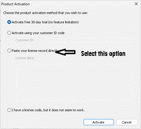 Select the “Paste your license code discreetly” option.