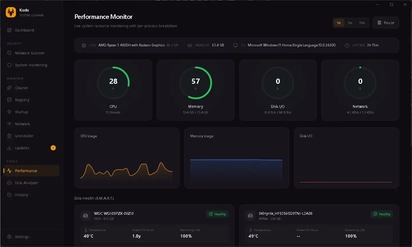 One of the more impressive features in Kudu for Windows is its Performance and Disk Analyzer section. You get a clear visual overview of how your storage is being used—broken down by folder and file type—making it easy to identify space hogs. The interface presents this information in a digestible way without overwhelming you with technical jargon.