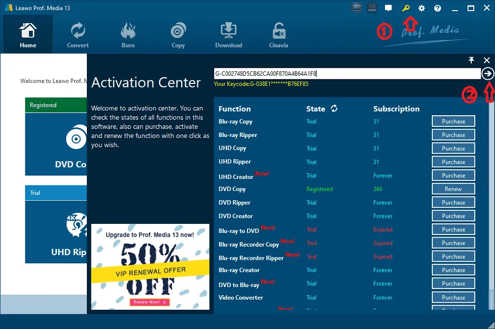 Open Leawo Prof. Media and navigate to the “Activation” centre. Enter the license code that you received to activate the video converter module.