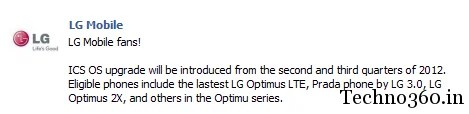 Coming back to LG announcement , it will be offering the Ice Cream Sandwich (ICS) OS upgrade for LG smart-phones which were introduced this year.In second quarter of 2012 the update will-be released for the following smartphone models: the LG Optimus LTE, Prada phone by LG 3.0, the LG Optimus 2X, the LG Optimus Sol, the LG my Touch Q and the LG Eclipse.