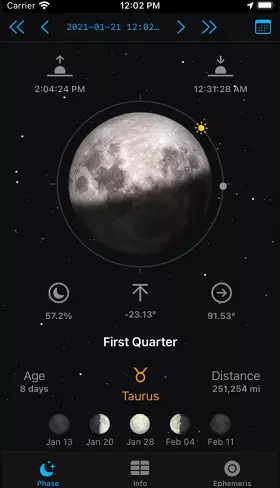 Accurate rendering of the current moon phase with useful parameters such as the rise and set times, illumination, altitude, heading, age, and distance. - Ephemeris