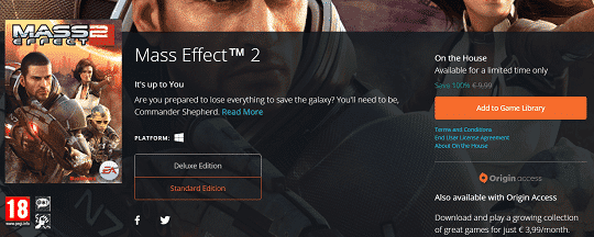 Starting today, EA’s game giveaway program “On the House” is offering Mass Effect 2 standard edition through Origin.As this is a standard edition, it doesn’t include any DLC’s and this is a time limited promotion, if you are interested claim the free copy as soon as possible.