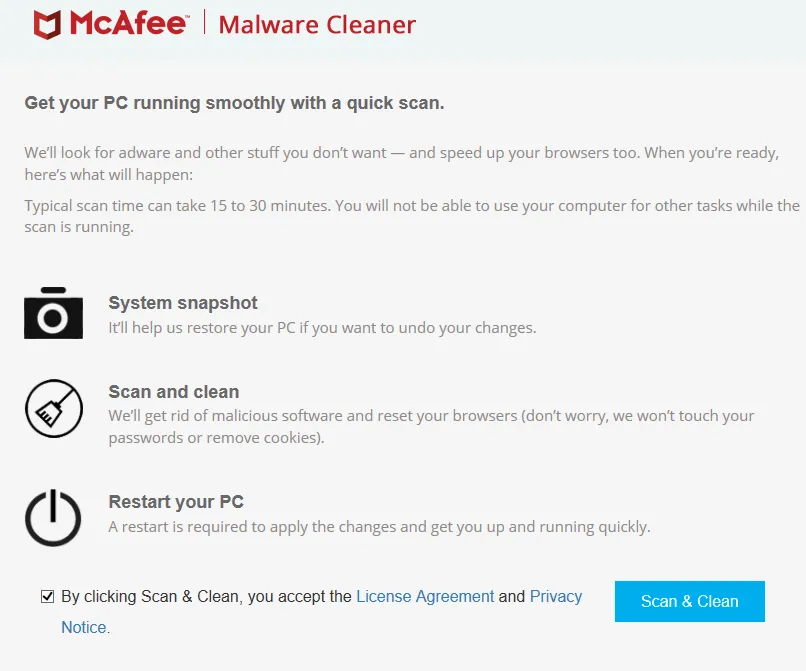 Download the “McAfee_Malware_Cleaner.exe” file, double-click it, and then follow the on-screen instructions to perform a system scan.