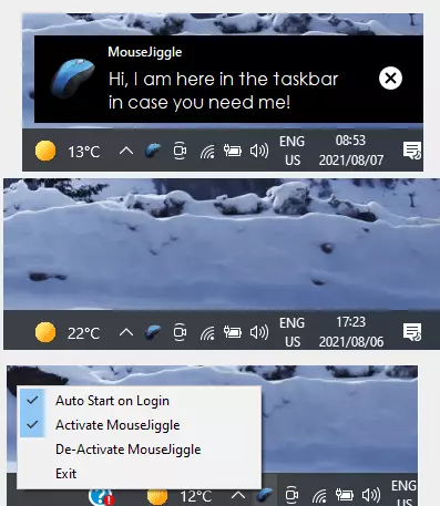 It does not have a standard interface because there are no major settings to deal with. As a result, double-clicking on the tray icon will not bring up the application’s window. Instead, right-click on it and set MouseJiggle to launch automatically when the current user logs in.