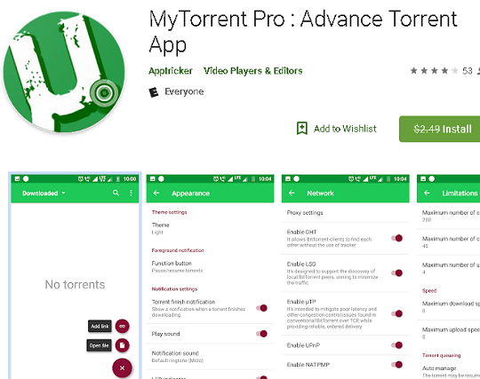 On Google Play, MyTorrent Pro app has 1000+ installations with 4.1 Star rating (out of 5) from 53 users.The app size is 11MB and requires Android OS 4.0.33 or later.