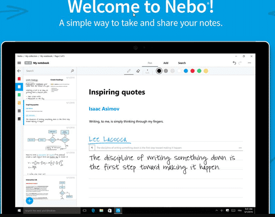 Available on the Windows and AppleApp stores, Nebo enables tablet users with active pens to write and edit their handwritten notes in real-time. Now, users can write complex mathematical equations, draw diagrams, sketch pictures and instantly convert to digital form for sharing, searching, and storage.