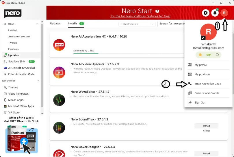 Now on the main interface of the Nero Start app, click the “Enter Activation Code” option available under your Account menu.