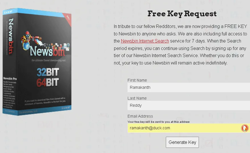 Enter your first name & last name, and email address and click the “Generate Key” button.