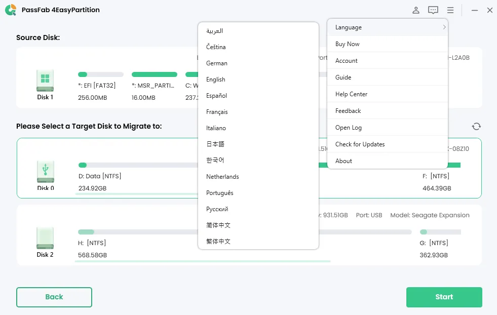 Select the disk you want to migrate from and the disk you want to migrate to, then click “Start” to continue.