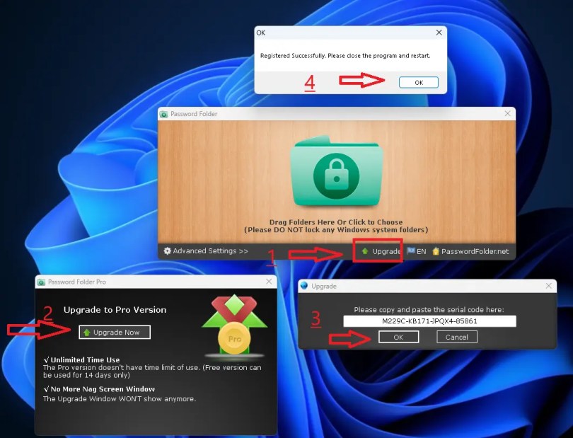 Install the software and start it up. Click “Upgrade” and enter the code below.