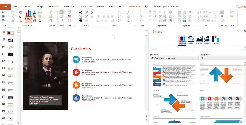 You can get hundreds of professionally designed templates from the Power-user add-library in’s and put them in with just one click.