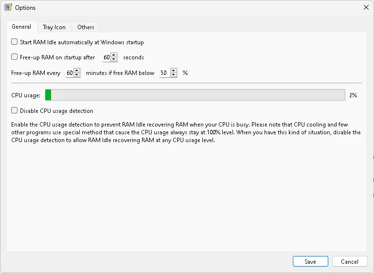 There are more optimization settings in the Options window. Using RAM Idle, we can release unused memory at regular intervals (every minute) or once the memory drops below 50%. We can set a hotkey to manually free RAM after an alarm sound.