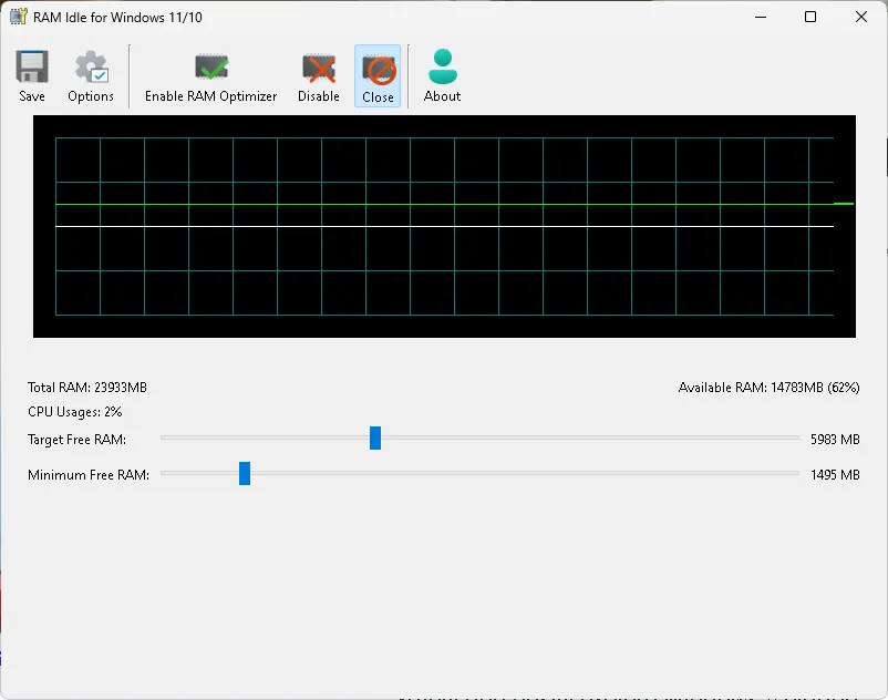 Clicking the “Enable RAM Optimizer” button allows the application to recover RAM when a particular level is reached automatically (you can define this using the sliders) to optimize system performance.