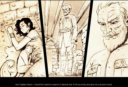 One night a storm destroys your ship, and you wake up alone on a seemingly deserted island. As fate would have it, the island is the same one as from The Mysterious Island, and so while you have to work to find food and create fire, eventually you stumble across the decaying remnants of past residents of the island (like a shelter and a nearly working windmill), and so your stay isn’t as difficult as might be otherwise. But you still need to figure out a way to escape, and for that, you have the help of a monkey named Jep and the ghost of Captain Nemo.