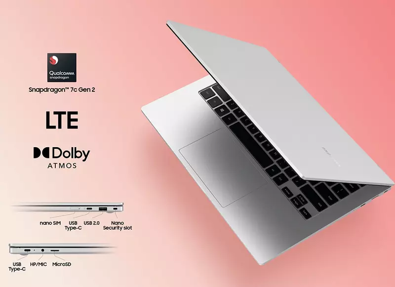 The Galaxy Book Go is a Windows 10 Home laptop with a 14.00-inch 1920×1080 pixel display. It is powered by a Qualcomm Snapdragon 7c Gen 2 CPU and has 4GB of RAM.