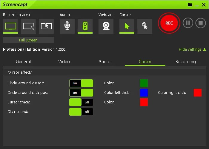 For recording the cursor, the ASCOMP software also has several additional settings. You can make the pointer invisible or add effects to make it stand out for specific actions. This is a lifesaver when showing software or conducting lessons, since it allows the audience to see the cursor.