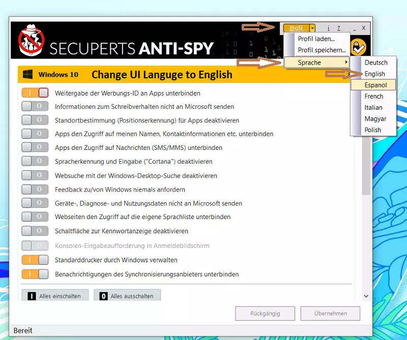 Launch SecuPerts Anti-Spy, on the main window, click ” Profil”, next click “Sprache” and select the language as English.