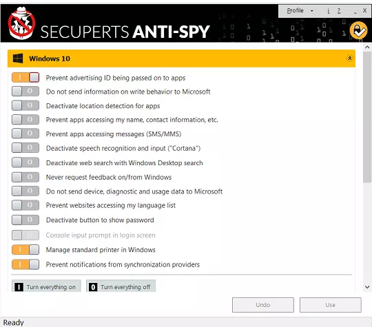 SecuPerts Anti-Spy enables you to disable over 80 obtrusive and, in some cases, extremely aggressive spy features built into the Windows OS, browsers, and media players.