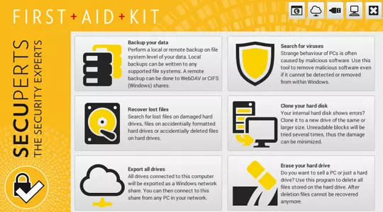 The SecuPerts First Aid Kit offers a separate operating system that can be run from either a DVD or a USB flash drive. It includes a variety of repair tools, antivirus software, and the ability to recover data when Windows fails to start.