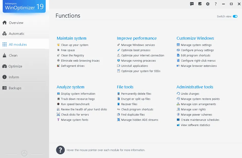 Ashampoo WinOptimizer 19 additionally maintains track of the health and integrity of your system with built-in system and hardware analysis tools.