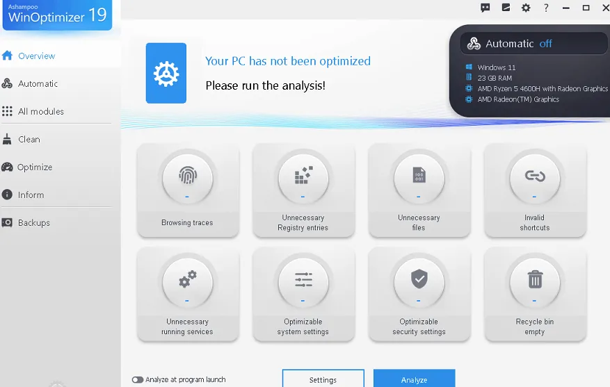 The main window or the overview portion of Ashampoo WinOptimizer 19 has a sleeker user interface and is very easy to use. It details your current system condition and allows you to do a system analysis.