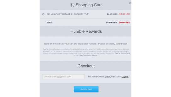Next, click on “Add to Cart” button, proceed to click “Get it for Free” button to receive an email from Humble Bundle.