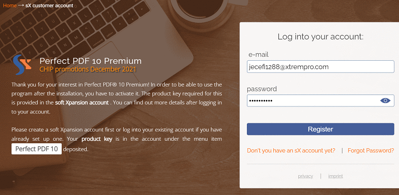 Enter your email address, password (SoftXpansion account) and click the “Register” button.