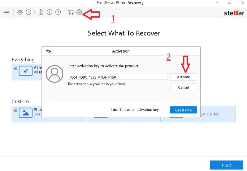 After the software is installed and launched, click the account or user icon on the main window. A popup window will appear; enter the code you received and click the “Activate” button.