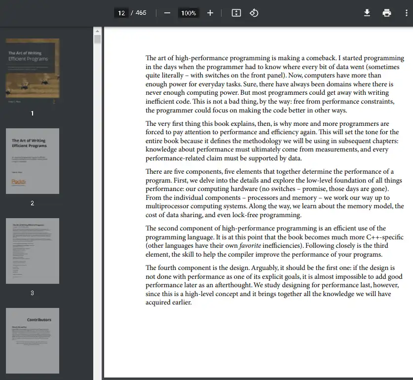 The Art of Efficient Programming goes over all the important parts of writing efficient programs, such as how to make good use of CPU resources and memory, how to avoid doing computations that aren’t needed, how to measure performance, and how to use concurrency and multithreading well. You will also learn about compiler optimizations and how to use the programming language C++ more efficiently. Lastly, you’ll understand how design decisions affect performance.
