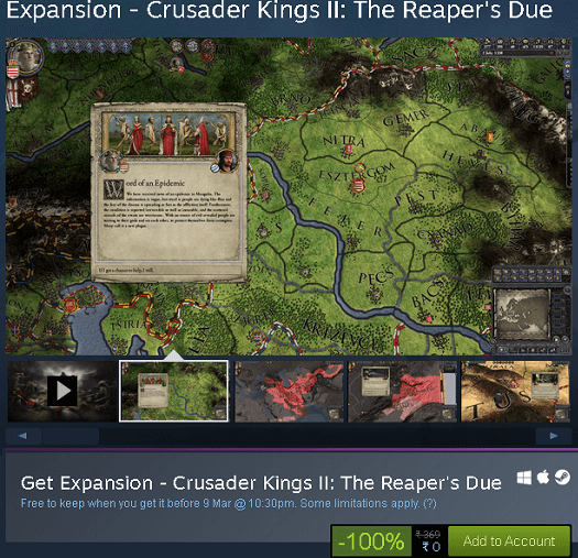 The Reaper’s Due is the 10th major expansion or DLC to the free to Play Game Crusader Kings 2. The usual price of this DLC is $9.99, now on Steam Store, it’s available at 100 % discount.