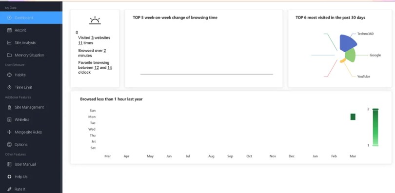 Anyone looking for further in-depth investigation can find all the tools they need in the Dashboard menu. It provides information about your most visited websites, days with less online activity, and trends in your overall web usage.