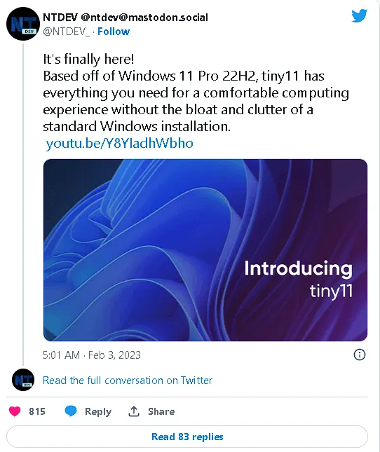 A Romanian YouTuber named NTDEV created Tiny11 and recently put it on the Internet Archive website. Amazingly, it can even run on just !