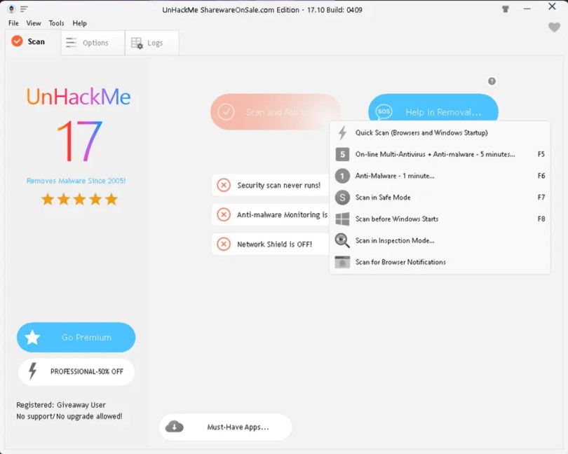 Download the giveaway version of UnHackMe (17.10) from the developer page: