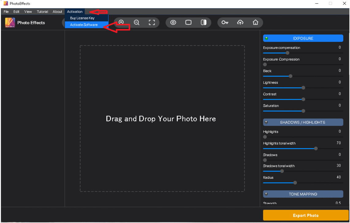 Install the software and launch the app, on the main window click the “Activate” drop-down menu and select the “Activate Software” option.