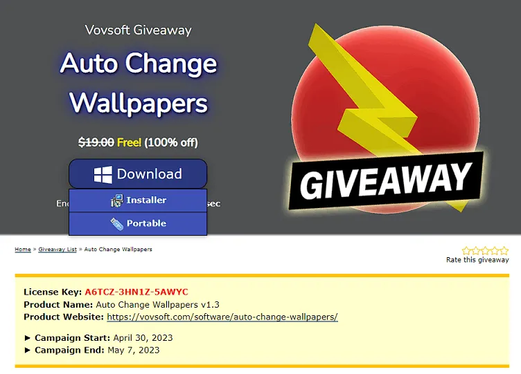 Vovsoft is giving away copies of their Auto Change Wallpapers software right now. The freebie provides a lifetime license (valued at $19) but does not include automatic upgrades. This limitation means that the software could get unregistered if the user updates it.