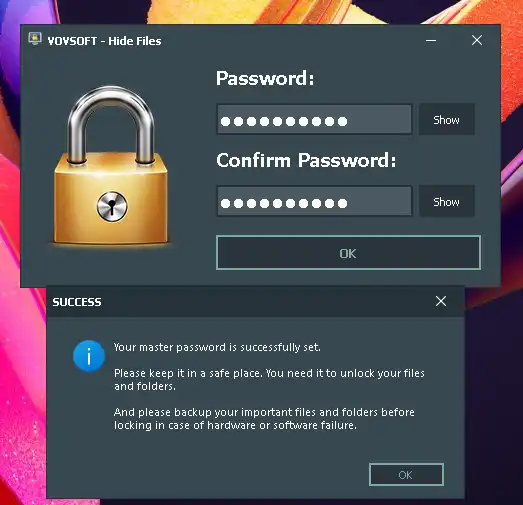 Avert prying eyes from your files and folders. Set your password and make sure your files are safe. No one can get into your files unless they know your master password.