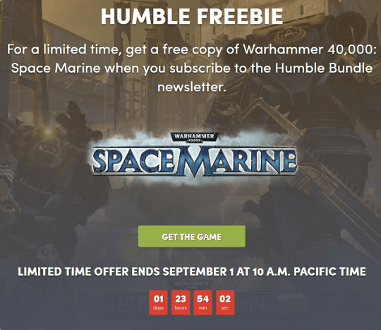 Simply subscribe the Humble Bundle newsletter and get a free copy of Warhammer 40,000: Space Marine (Worth $29.99).