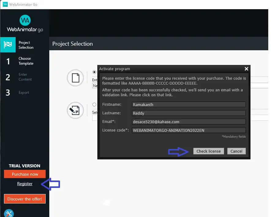 Type in your first and last name, your email address, and the license code shown below.