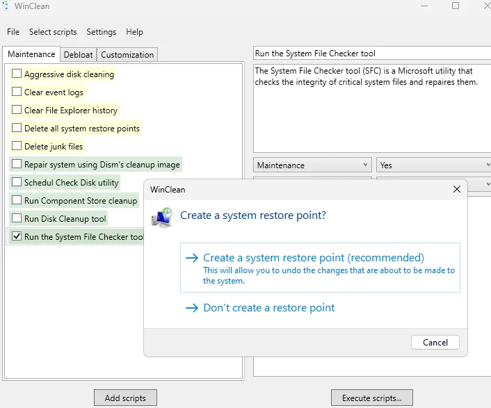 Before executing the scripts, the program will prompt you to create a system restore point for your PC protection.