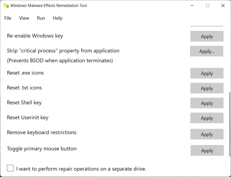 M.E.R.T. gives you precise control over the repairs you carry out. Removing “critical process” rights from malicious apps or resetting the User Account Control (UAC) may be necessary. The tool got you covered. The tool also provides the option to restore frequently targeted settings such as .exe and .txt file icons.