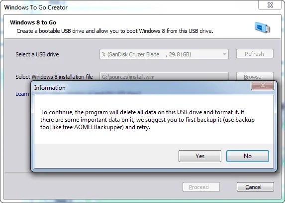 Click “Proceed”. The program will delete all data on this USB drive and format it. If there are some important data on it, it will suggest you to use AOMEI Backupper to back them up first. Click “Yes”, the program will create Windows 8 bootable USB drive.
