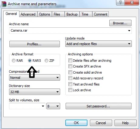 Next select the Archive format as ‘RAR 5’ (instead of RAR 4) on archive name and parameters dialog and proceed to compression by clicking on “OK” button.