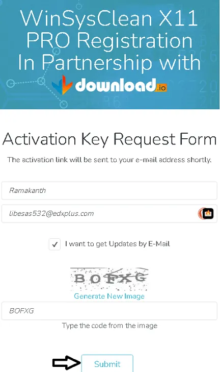 Enter your name, email address, and a valid captcha code in the fields provided. To proceed, click the “Submit” button.